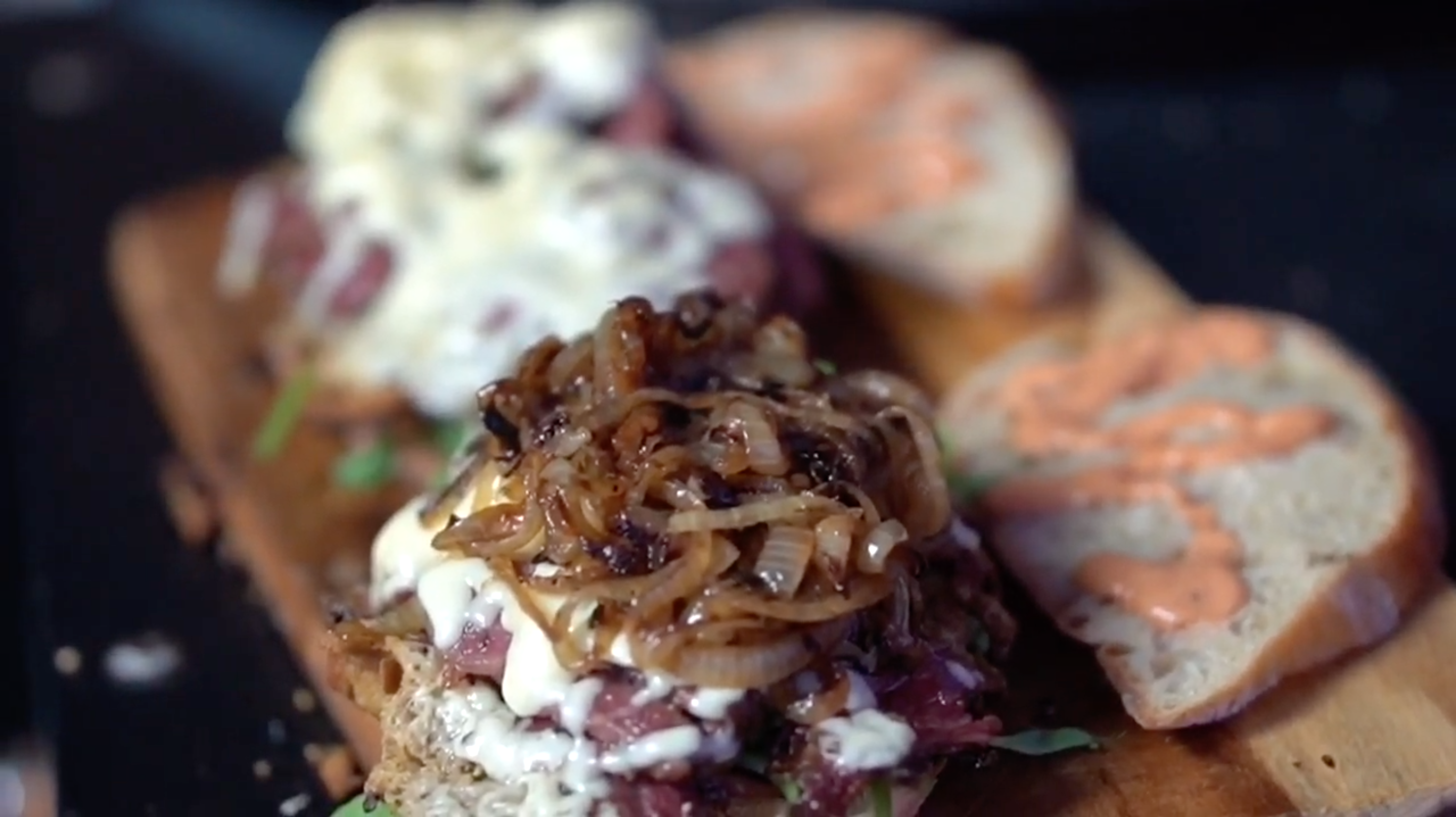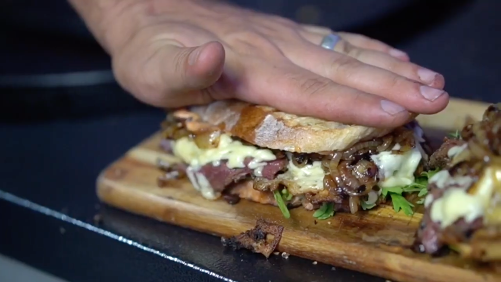 Saftiges Pastrami-Sandwich, mit Käse überbacken, karamellisierten Zwiebeln verfeinert und Russian Dressing vollendet zwischen zwei krossen Ciabatta-Baguette-Scheiben. Uns läuft schon beim Anblick der Zutaten, aber erst recht bei den Bildern das Wasser im Mund zusammen. Vielen Dank an Marian Ried für das tolle Rezept und Euch viel Spaß beim Nachgrillen!