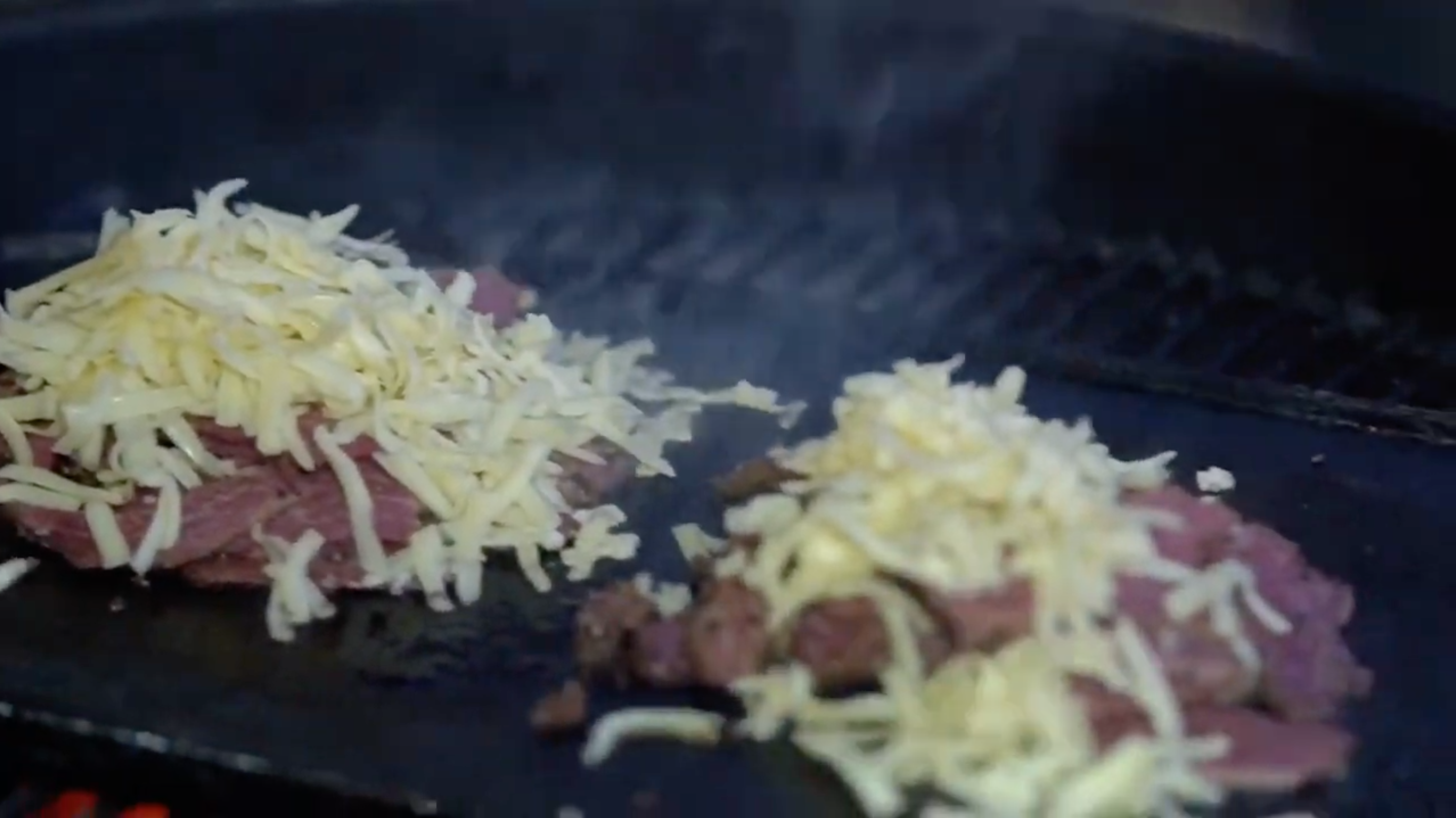 5. Pastrami in 2 Portionen auf einer Grillplatte angrillen und mit dem geriebenen Käse bedecken. Deckel des Grill schließen, damit der Käse schmilzt.