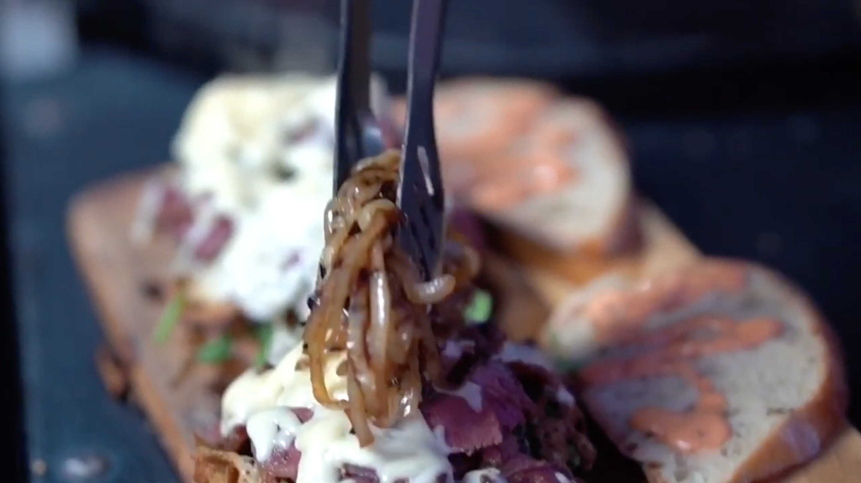 8. Geschmorte Zwiebeln darauf legen, wahlweise noch mal Sauce darauf und mit einem weiterem Ciabatta bedecken.